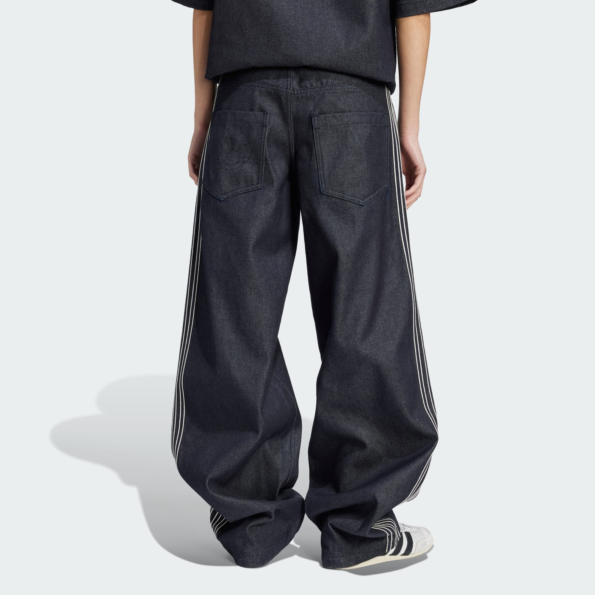 Dlhé denimové nohavice s vysokým pásom a ikonickými 3 prúžkami pozdĺž bokov.