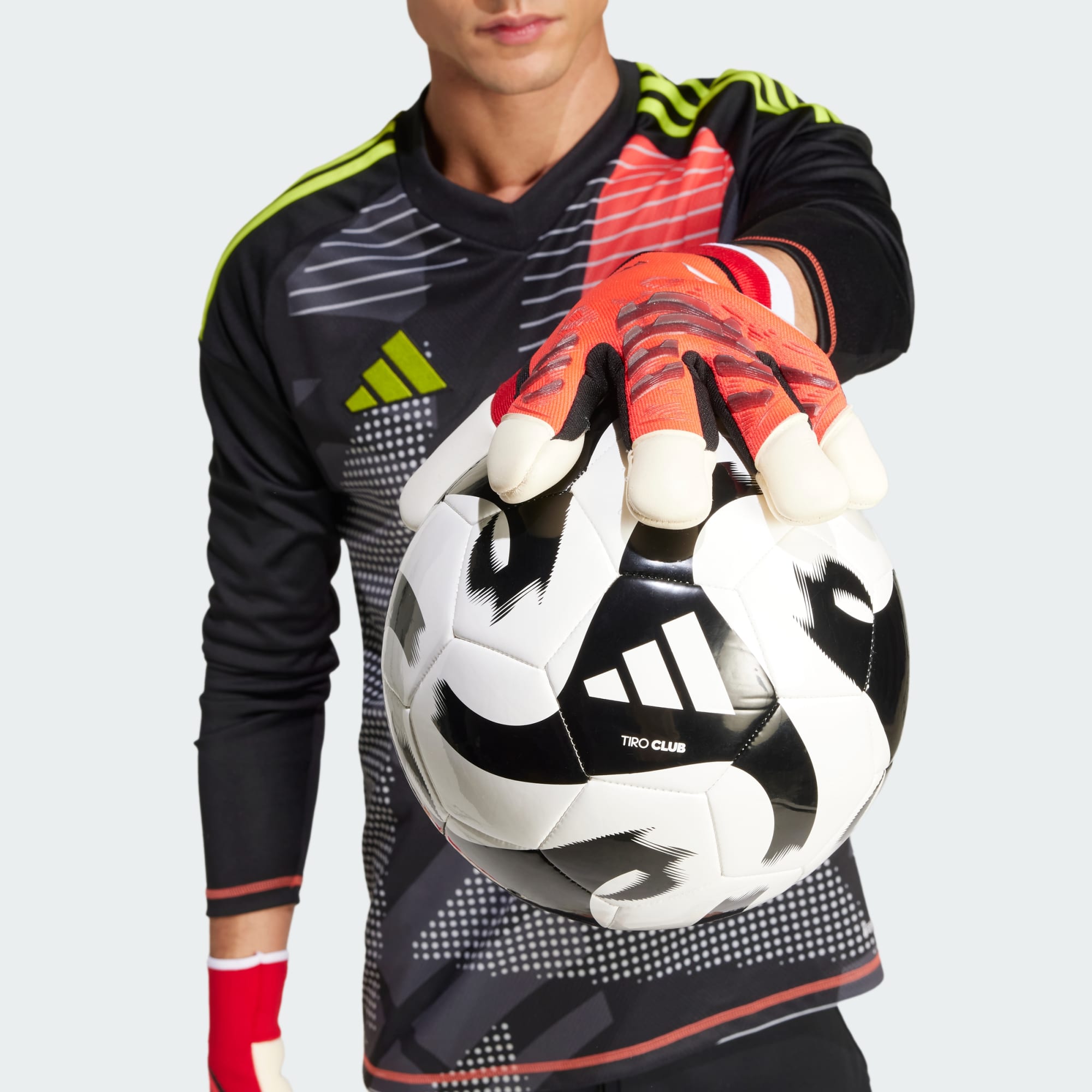 Get to the ball every time in adidas Predator Pro goalkeeper gloves used by the world's best players. They have super-grippy URG 1.0 palms with extra latex running over the fingertips to create a larger contact area. The adaptive knit backhand includes silicone elements for pinpoint punching, and a strapless entry provides a natural-feeling fit at the wrist.