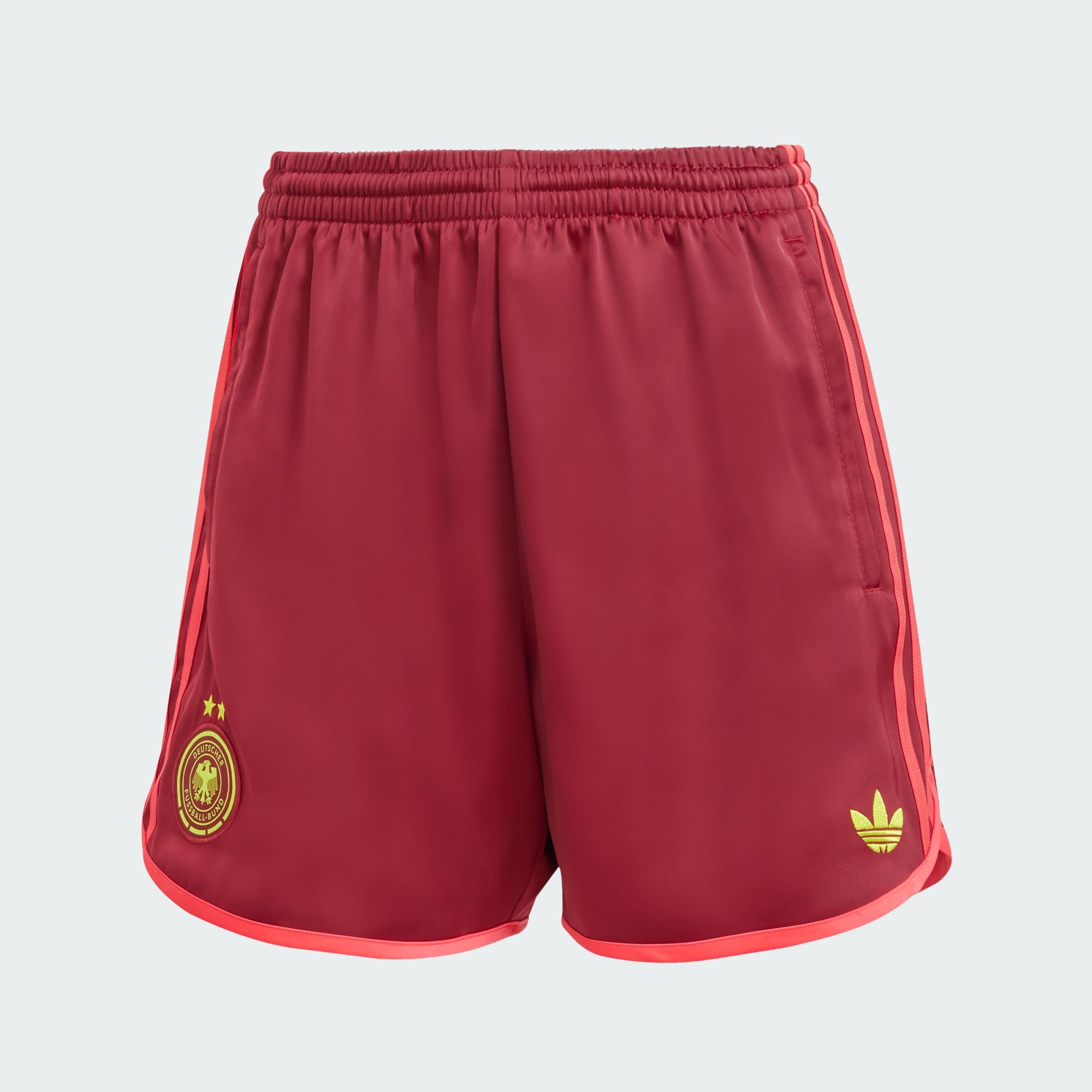 Obleč si tieto nesmierne pohodlné futbalové šortky od adidas a ukáž svoju vášeň pre národný tím. Sú elegantne jednoduché, pretože sme ich vyrobili z hladkého saténu a doladili Trojlístkom a tímom nemeckej ženskej zostavy. Farby si prepožičiavajú z hosťovskej súpravy, ktorá je inšpirovaná umením.