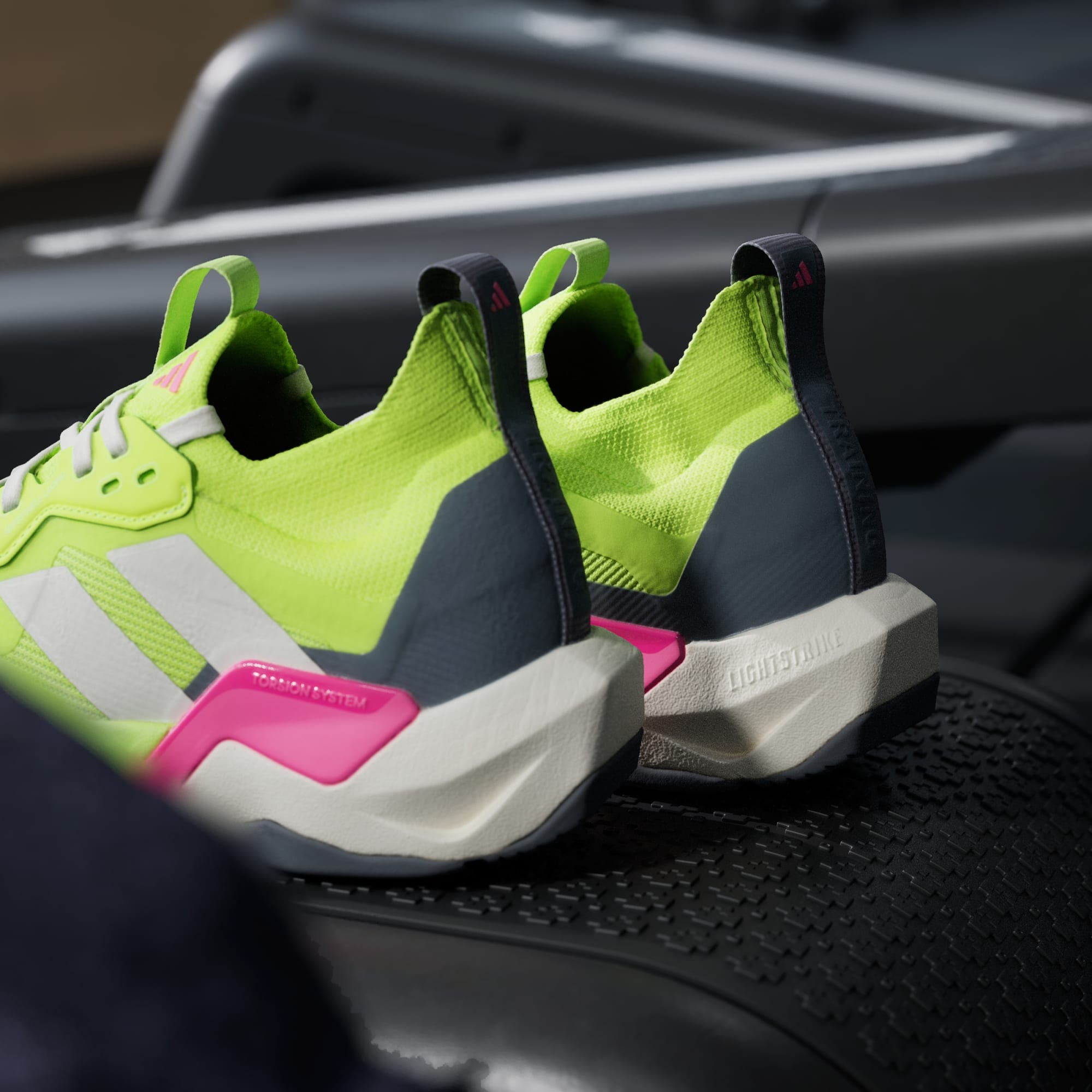 Žiarivá neónovozelená a ružová športová obuv s výraznými dizajnovými prvkami vyniká na tmavom pozadí.