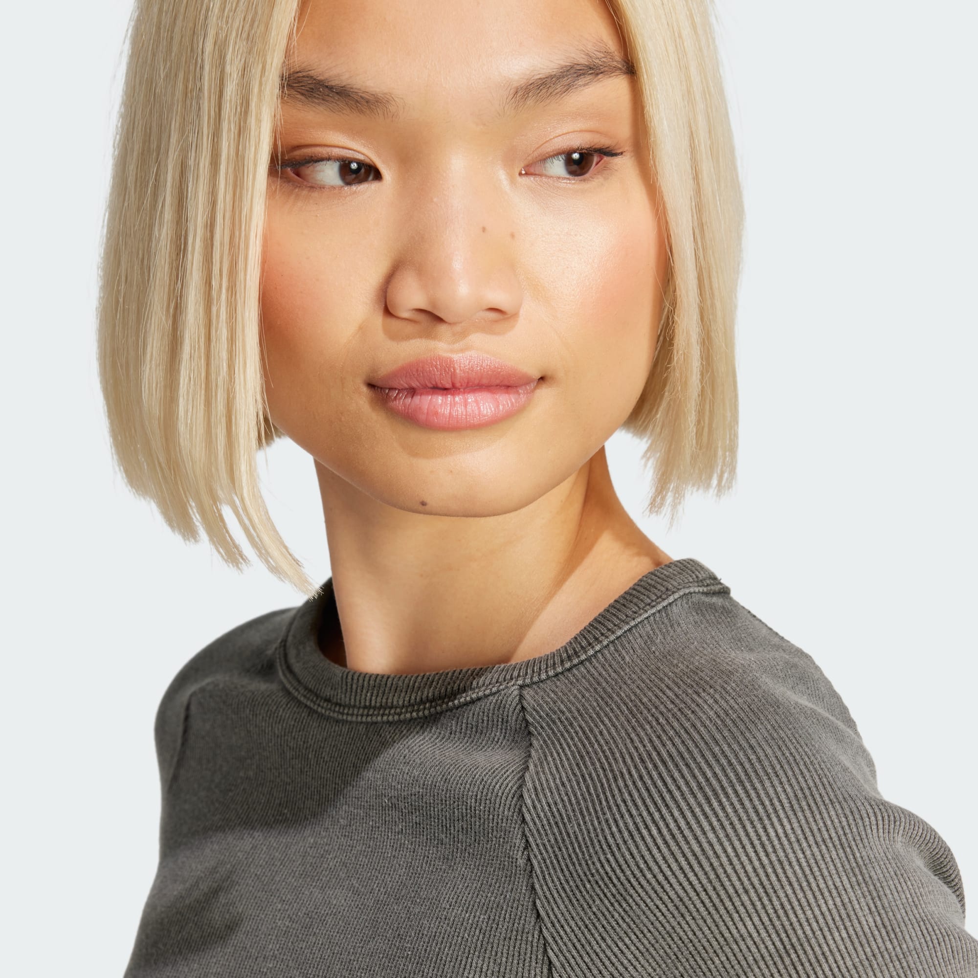 Tento skrátený top adidas je inšpirovaný odvážnym hiphopovým štýlom z 90. rokov. Má úzku vrúbkovanú konštrukciu s dlhými rukávmi a klasickým výstrihom, ktorá ležérne obopína telo, a dopĺňa ho grafický motív s opakujúcim sa Trojlístkom pozdĺž lemu.